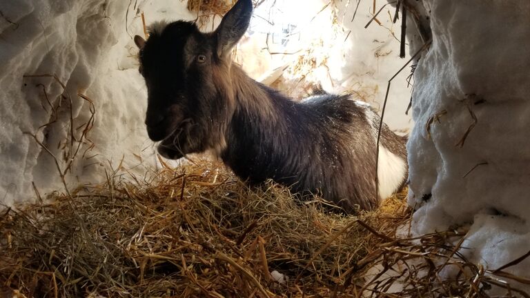 Long story: The goats needed a shelter of some sort, as it gets very cold up in northern Wisconsin. The first attempt at a shelter was just some straw piled around for them to nest in, but it was clearly insufficient, so we then constructed an approximate cube (resting on 4 flakes of straw) out of 4 pallets, connecting them together with small 'connector boards' (3"x6" to 4.5"x9" pieces cut from screppier pallets) and deck screws, and then tying several flakes of straw to the sides so that it would be cozy.