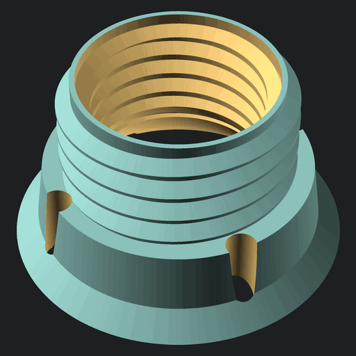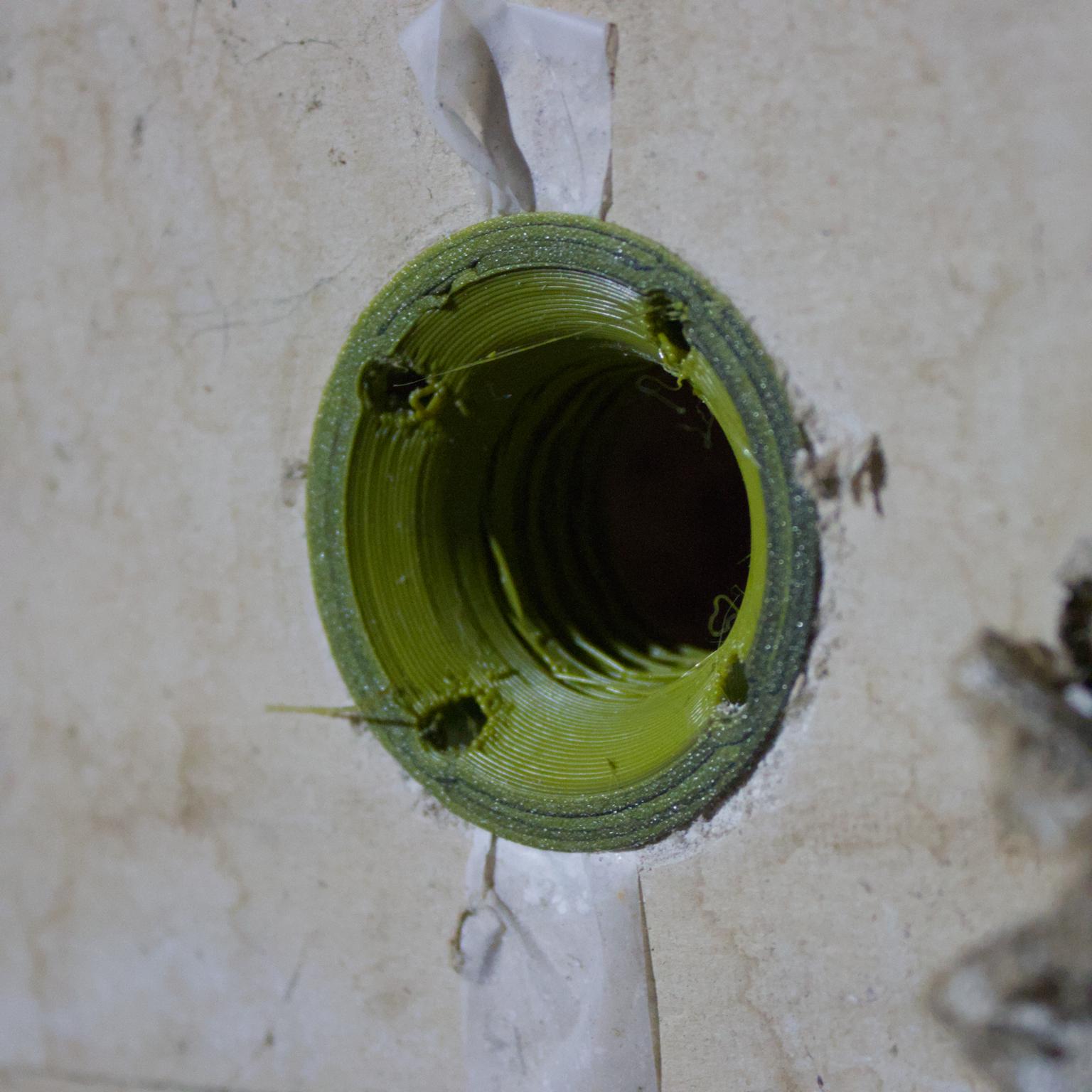 - Thread the port into the nut. You can put a couple of #6 screws in the 'spanner wrench' and use it to help drive the port in. The tape should prevent the nut from turning too much while allowing enough movement for it to become centered. The flanges serve to center the port in the hole you drilled, and can also crush down the drywall around it slightly, like a drywall screw, so that the port ends up flush with the wall.